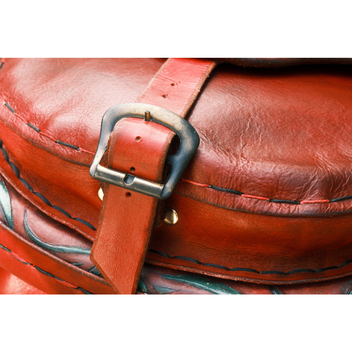 Handmade leather with fully lined interior including two inner pockets made of soft leather. Hand stitched with hand waxed multi colored cording. Hand painted, dyed, and sealed with original artwork and tooling. The strap is detailed with hand tooled and painted with wildflowers and vines. Multi mixed metal embellishments on straps with a vintage buckle closure. This is a one-of-kind wearable art piece that will become more beautiful with age.